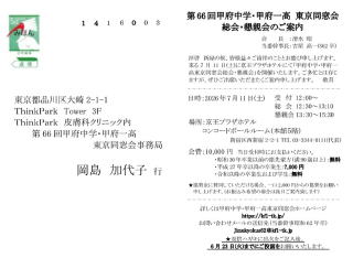 | 甲府一高東京同窓会 学年幹事・会員各位 第66 回甲府中学・甲府一高東京同窓会 当番幹事長(昭和62 年卒) 古屋 高一 第66回 甲府中学・甲府一高 東京同窓会 記念誌「日新鐘」第30号への広告掲載・協賛ご協力のお願い 謹啓 皆様におかれましては、ますますご清栄のこととお慶び申し上げます。 平素より甲府中学・甲府一高同窓会に格別のご指導ご高配を賜り、厚く御礼申し上げます。 さて、本年7月11日(土)に第66回(2026年度)甲府中学・甲府一高東京同窓会・懇親会を京王プラザホ テルにて開催する運びとなりました。 本年度のテーマは、 「同窓生、その窓がひろくとき。 」です。 混迷を極める国際情勢、恒常的なインフレなど不安定な社会環境にあればこそ、山梨を離れた東京で旧交 をあたため、また情報交換をする場として、東京同窓会の役割はますます大きなものとなっております。 この困難な時代を生きていくため、いまいちと内なる窓を開き、 -高生としての自覚を促していきたい。 若い同窓生たちには、学舎の窓より仰いだ富士のごとくその自覚が蘇ってくる契機にしてほしい。そんな思 いでテーマといたしました。 つきましては、東京同窓会の更なる発展にご理解とご協力を賜りたく、ご協賛または記念誌「日新鐘」第 32号への広告掲載をぜひご検討くださいますよう、謹んでお願い申し上げる次第です。 今後もこの東京同窓会が、たゆまず未来に向けて進んでいけるよう、何卒ご協力をお願いいたします。 なお、お手数ではございますが、申し込みは以下の【協賛申込書】または【広告申込書】に必要事項をご 記入いただけますと幸甚に存じます。 末筆ではありますが、皆様の益々のご健勝とご多幸をお祈り申し上げます。 「日新鐘」第32号広告・協賛のお申込要領 1,お申込方法 「第66回同窓会広告・協賛申込書」に必要事項をご 記入の上、電子メールに添付してお送りください。 ・もしくは、同封の返信用封筒で郵送してください。 2.申込期日 ◆ 2026年5月30日 3.お申込先 <電子メールの場合> ここをクリックしてください <ご郵送の場合> 〒 141-6003 東京都品川区大崎2-1-1 Think Park Tower 3F 丁hink Park皮膚科クリニック内 甲府中学・甲府一高同窓会広告部会宛 4,請求書、領収書の発行について ・「協賛申込書」の該当欄にご記入下さい。 ・内訳名は「協賛金」以外の名称が必要な場合のみご記入下さい。 5、.お支払方法 ・請求書に記載の銀行口座にお振込をお願い申し上げます。 (請求書の発行は5月を予定しております) 6,お問合せ先 第66回甲府中学・甲府第一高校同窓会 広告部会:;小川真木 電子メールはここをクリック 以下の資料は作製完了次第掲載します 日新鐘広告・協賛の依頼とご説明pdf 日新鐘広告申込書pdf 東京同窓会協賛金申込書.pdf |