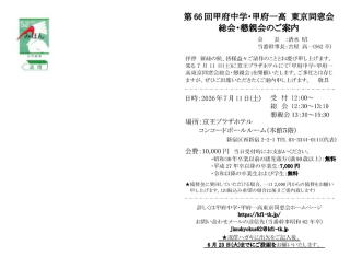 | 甲府中学・甲府一高東京同窓会 2026年3月吉日、 役員・各学年幹事各位 第66回甲府中学・甲府一高東京同窓会 当番幹事長(昭和62 年卒)古屋 高一 甲府中学・甲府一高東京同窓会幹事会のご案内(pdf) 春陽の候、益々ご清祥のこととお慶び申し上げます。平素は格別のご高配を賜り厚く御礼申し上げます。 さて、2026年度の幹事会を下記のとおり開催いたしますので、ご案内申し上げます。 なお、誠に恐れ入りますが、開場準備の都合上、4月21日(火)までに出欠をお知らせいただきますよう お願い申し上げます。 記